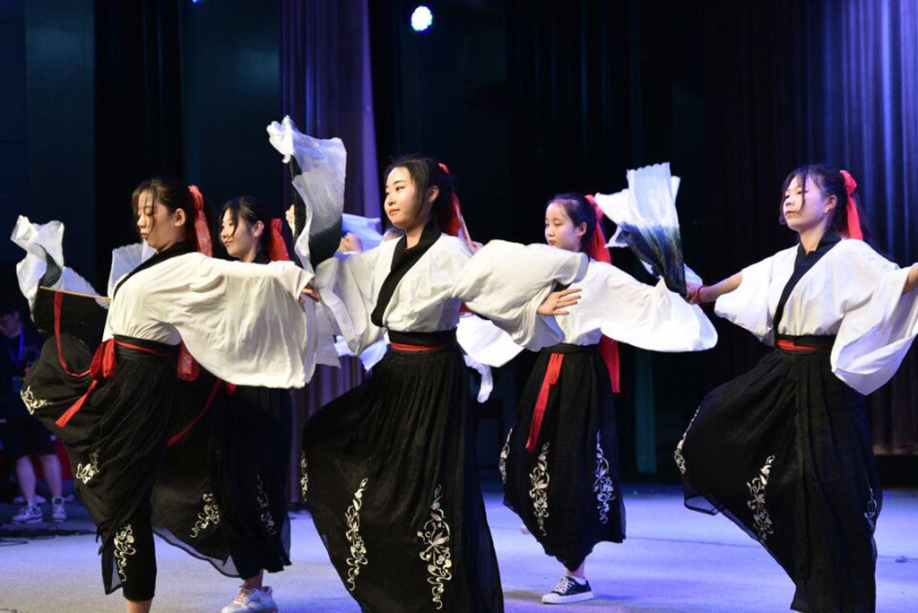 法語文化節,不僅僅展現法國文化,中國傳統文化亦穿插其中。2019級學生段一冉的葫蘆絲演奏——《竹樓情歌》,通過葫蘆絲柔美細膩的獨特韻律,為晚會來帶了濃郁的傣族風情;竹園3號書院的舞蹈《書簡舞》,在同學們身著漢服,手持舞扇翩翩起舞中,將漢服的柔美飄逸、灑脫英氣展現得淋漓盡致,用舞蹈的形式向觀眾表現漢服的韻味與風采;丁香2號書院的相聲《打燈謎》,在傳統相聲的基礎上,將校園生活、中法合作辦學等元素融入其中,幽默的語言、巧妙的包袱,真實的反映了校園生活和我校學生精神風貌,引得現場一陣陣歡笑和贊許。