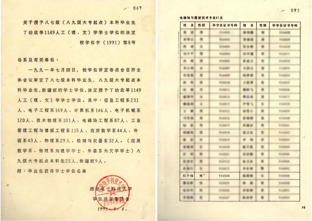 ▲關于授予八七級(八九級大專起點)本科畢業生丁幼欣等1149人工(理、文) 學學士學位的決定(西電檔案館館藏)