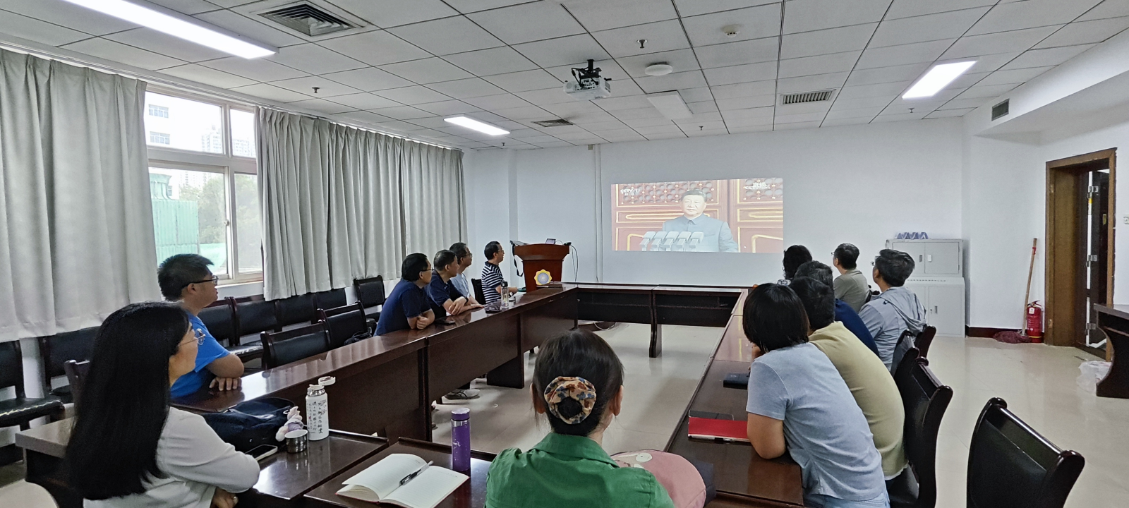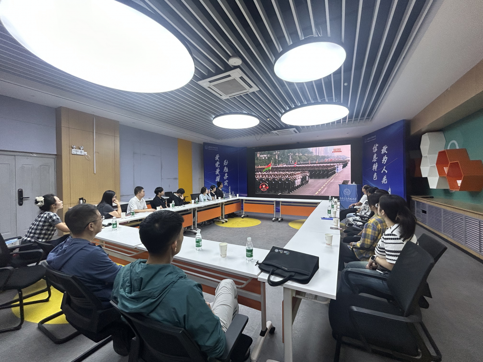 學院在北校區主樓三區201會議室、南校區大學生活動中心116會議室設立主會場,學院班子成員、黨委委員、系所主任、黨支部書記、機關工作人員、輔導員及學生代表150余人參加。隨著80響禮炮響徹云霄,五星紅旗冉冉升起,全體人員肅立高唱國歌;習近平總書記發表重要講話時,大家凝神聆聽、認真記錄;閱兵方陣鐵甲洪流駛過屏幕,現場掌聲經久不息,愛國熱情在每個人胸中激蕩。