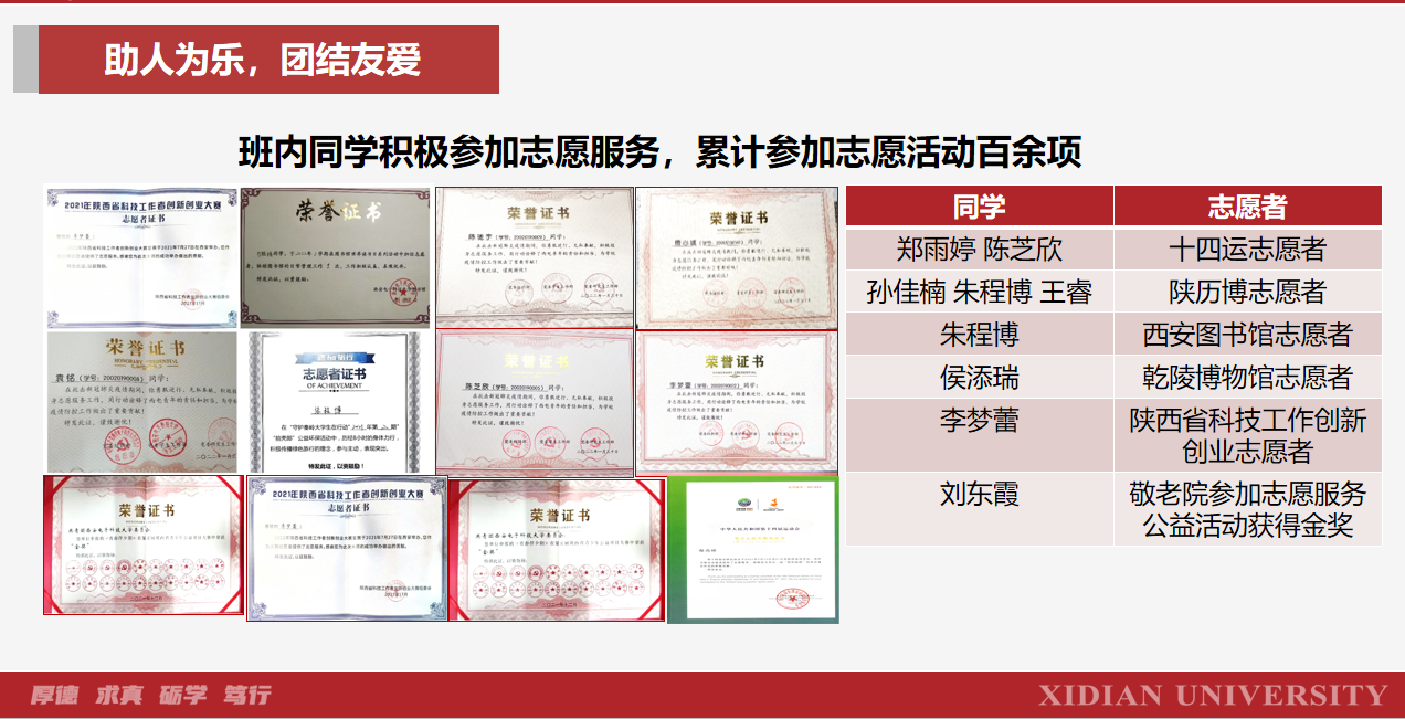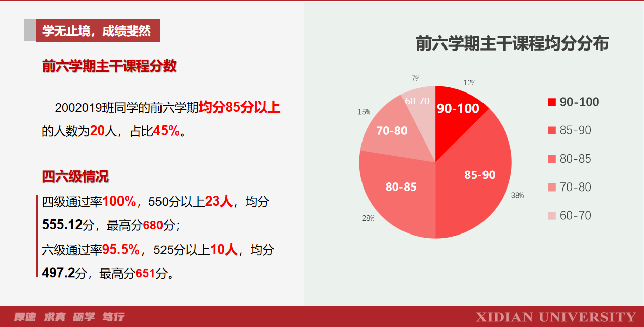 何恃而往,一葦以航。2002019班的同學們時刻牢記“厚德、求真、礪學、篤行”的西電校訓,始終保持著勤學好問、進取向上的班級氛圍。三年累計獲得獎學金28萬余元,人均超過7000元。他們在良性競爭中團結互助,共同進步。2002019班共保研23人,保研率達53%。他們前途似海,去往清華、北大、浙大、上交等名校,更有11名同學響應“畢德顯班”人才培養宗旨的號召選擇留在西電繼續深造。