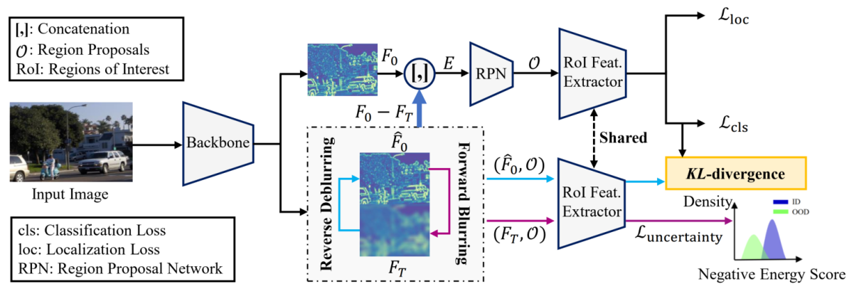 武阿明博士論文“Deep Feature Deblurring Diffusion for Detecting Out-of-Distribution Objects”提出了一種用于生成分布外特征的擴散機制(深度特征去模糊擴散)。通過利用生成的特征,緩解了缺乏分布外數據的影響,提升了模型區分分布外物體和分布內物體的能力。多個檢測任務和數據集上的實驗結果表明了所提方法的有效性。