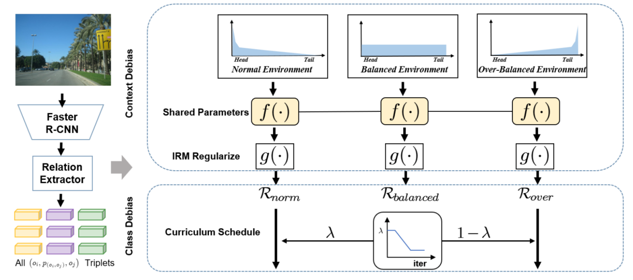 閔聿寬博士論文“Environment-Invariant Curriculum Relation Learning for Fine-Grained Scene Graph Generation”提出了一種基于不變課程關系學習的場景圖生成方法。基于場景圖生成任務中存在的問題,首先為場景中的各個實體構建不同的采樣分布環境,并以此學習一個對環境變化穩定不變的模型,緩解場景圖生成中的實體數量不平衡問題。其次,為了減輕實體關系的不平衡現象,構建了類均衡的課程學習策略,以平衡不同的學習環境,消除實體關系中的不平衡。實驗結果證明了本方法能夠優化多種現有的場景圖生成模型。