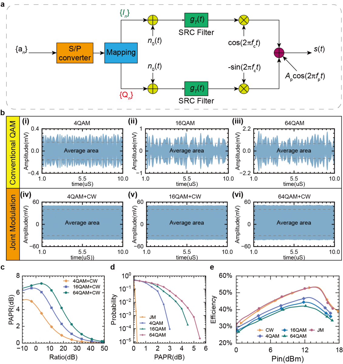 該成果提出了一種高性能聯合調制功率放大可編程超表面攜能通信系統。攜能通信技術(Simultaneous wireless information and power transfer , 簡稱SWIPT)被認為是解決未來物聯網低功耗設備和無線傳感器持續通信的一個重要的解決方案。與傳統的無線信息傳輸和能量傳輸系統不同,SWIPT系統需要平衡通信速率和能量傳輸效率,以實現能量和信息的最優傳輸。在理論上,大規模多天線系統和相控陣列系統作為經典的無線系統實現方式被廣泛應用于SWIPT。然而這兩種系統需要大量的收發組件和射頻模塊,因此存在造價高昂、效率低、空間調控靈活性弱、可實現性差等問題。