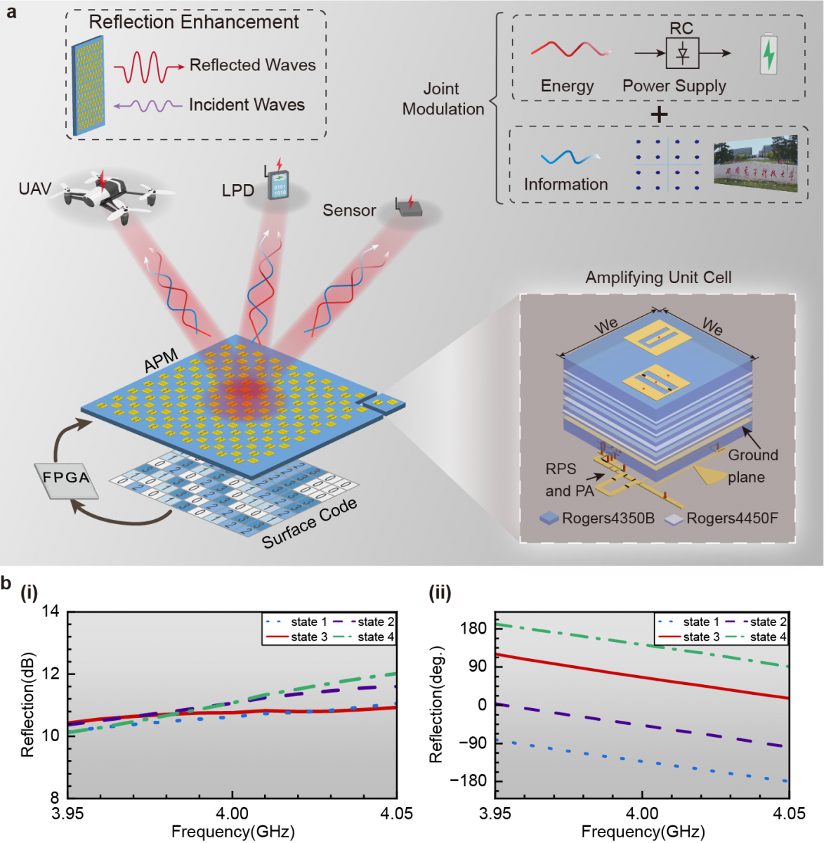 圖1 功率放大可編程超表面攜能通信系統示意圖與單元散射特性(Nat. Commun. 14, 6002, 2023)