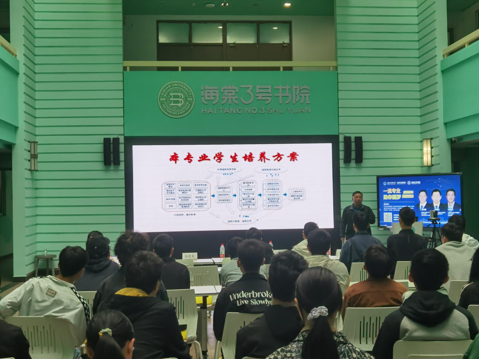 (通訊員 張玲 陳幸)為幫助2022級本科生更好地了解電子工程學院學科發展、專業特點,解答學生大類分流相關問題,電子工程學院聯合海棠3號書院舉辦學科導論系列講座。4月21日下午,電子工程學院信息對抗技術專業董春曦教授、湯建龍副教授,遙感科學與技術專業袁曉光副教授、張偉濤副教授來到海棠8號樓,為同學們介紹了2個專業的培養目標、培養方案、專業優勢、師資力量以及未來深造就業前景。60余名學生到場參加,線上直播吸引近300名學生參與。