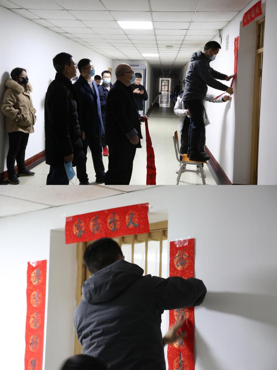 活動中,由學院領導親自給留校學生發放過年大禮包,走進宿舍慰問學生,了解學生的生活和學習情況,叮囑學生要和家長保持溝通,讓家長放心,學校和學院一定能讓大家在校如在家一樣快樂,過一個不一樣的虎年。此外,學院領導與同學一道,貼上了導師飽含祝福的手寫春聯,上聯“論文項目兩開花”、下聯“學業愛情雙豐收”,橫批“人生贏家”,大家在春聯下共同合影留念,讓遠離家鄉的學生們感受“家”一般的溫暖,體驗不一樣的春節。
