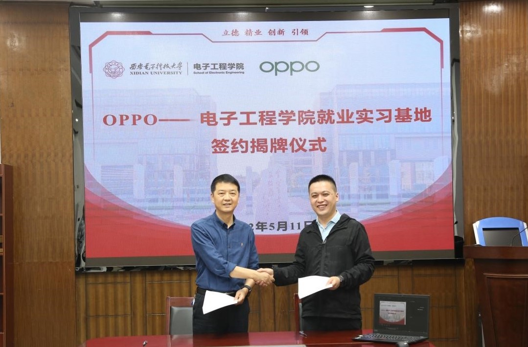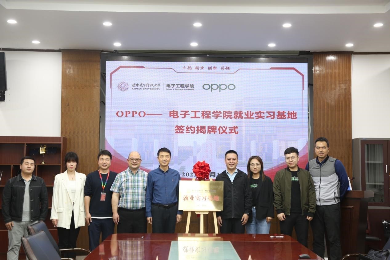 (通訊員趙彤璐)5月11日,電子工程學院與OPPO廣東移動通信有限公司在北校區辦公樓第三會議室舉行就業實習基地合作協議簽約暨揭牌儀式。電院黨委書記楊光暐與OPPO西安HR負責人陳澤鳴為就業實習基地揭牌。OPPO西安研發中心產品開發負責人余厚暉、校園招聘負責人寧靜通過線上方式出席活動,OPPO招聘經理薄夢君、HRBP李逸飛參加此次揭牌儀式,儀式由電院副院長梁繼民主持。