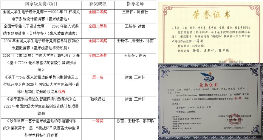 依托該項目及課程,運用毫米波雷達平臺及課程學習的知識,參加了大學生全國電子設計競賽、互聯網+創新創業競賽等全國性競賽及項目,并指導學生獲得了優異的競賽成績,其中包括全國電賽TI模擬專題賽國二2項,全國電賽嵌入式專題賽國二1項,全國電賽瑞薩前沿信息專題賽國二1項,中國互聯網+創新創業競賽省級金獎1項,中國計算機設計競賽國二1項,國創結題優秀第一1項,國創項目4項,其他項目6項。多名學生受益于該課程提升能力,保送清華大學等高校。