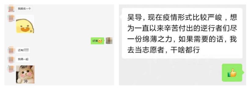 碩士20級第四黨支部黨員李文華,為緩解抗疫壓力,主動請纓,為抗擊疫貢獻自己的力量;碩士20級第四黨支部發布志愿者倡議書,組織黨員組建疫情防控志愿小組。倡議書一發,各位黨員同志積極響應,紛紛加入志愿者隊伍。組內黨員同志時刻處于待命狀態,確保遇到工作任務時,能夠第一時間頂的上。