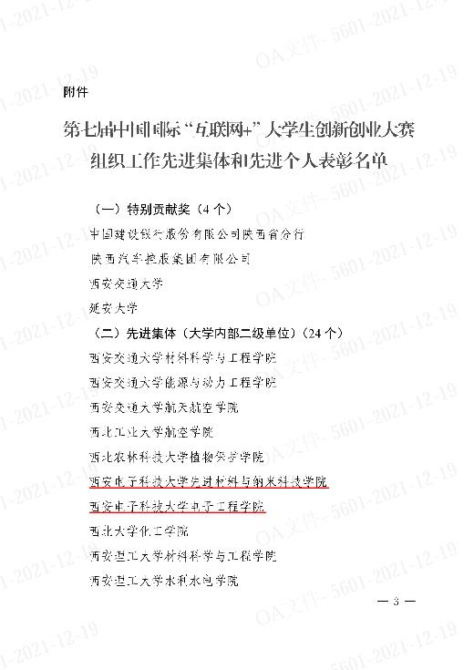 (通訊員 李雨煙 楊峻瑋)近日,陜西省教育廳發布《關于表彰第七屆中國國際“互聯網+”大學生創新創業大賽陜西賽區組織工作先進集體和先進個人的通報》,電子工程學院榮獲組織工作先進集體。