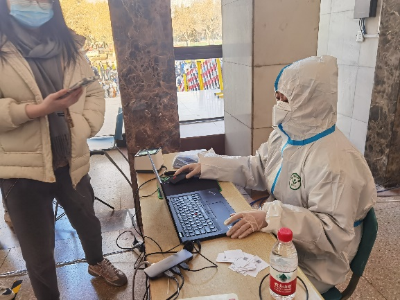 志愿者們有的穿上白色防護服成為“大白”,協助醫護人員核查數據,有的在排隊處引導同學們有序檢測。