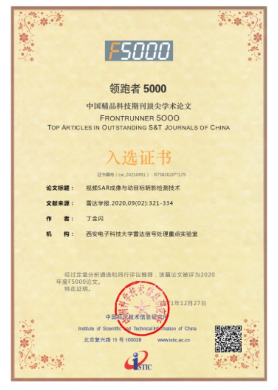 (通訊員劉昕雨)2021年12月27日,科技部中國科學技術信息研究所發布了2020年度“領跑者5000-中國精品科技期刊頂尖學術論文”(簡稱F5000)獲獎名單,我院丁金閃教授論文《視頻SAR成像與動目標陰影檢測技術》入選,論文于2020年4月發表在EI檢索中文期刊《雷達學報》上。論文提出了視頻雷達成像與目標檢測技術框架與關鍵算法,發表以來得到了行業高度評價。
