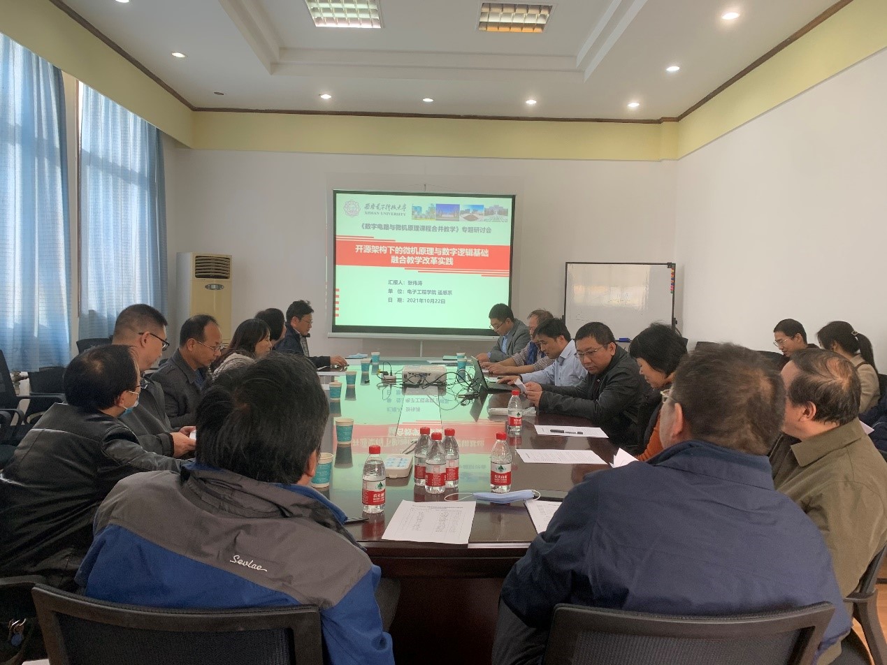(通訊員張偉濤)電子工程學院始終堅持“以本為本”,推進“四個回歸”,積極開展一流本科教育的探索與實踐。為進一步做好本科課程學時壓縮,為學院各專業培養方案的修訂提供參考依據,學院已于2021年上學期完成了《數字電子技術基礎》和《微機原理與系統設計》兩門課程的合并教學試點工作。為及時總結試點教學的經驗,反饋兩門課程合并教學的難點問題,推動合并教學的進一步發展,10月22日下午,學院在北校區辦公樓402會議室組織召開了數字電路與微機原理課程合并教學專題研討會,張偉濤副教授代表三位教學試點教師做關于合并教學的主題報告,學院副院長鄧成出席會議,并邀請了省級教學名師周佳社教授和孫萬蓉教授進行現場指導,兩門課程的負責人、任課教師、相關實驗課教師和青年教師參加了會議,會議由任愛鋒主持。