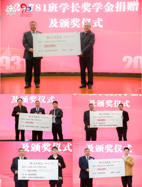 捐贈儀式分別由2-781班校友代表、貴州龍頭馬集團代表、何文偉校友、江蘇肯立科技股份有限公司代表、上海霍萊沃電子系統技術股份有限公司代表上臺向學校贈送支票牌,由楊銀堂為企業代表和個人頒發證書。