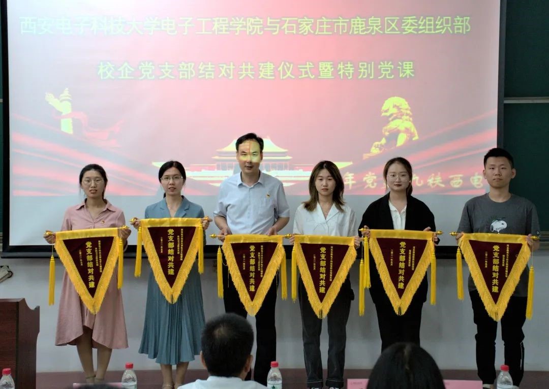儀式中,西安電子科技大學電子工程學院2018級黨支部學生代表與鹿泉區委組織部代表互授校企黨支部結對共建合作錦旗,鹿泉區委組織部一行向學生支部贈送了黨旗、黨章、黨徽。