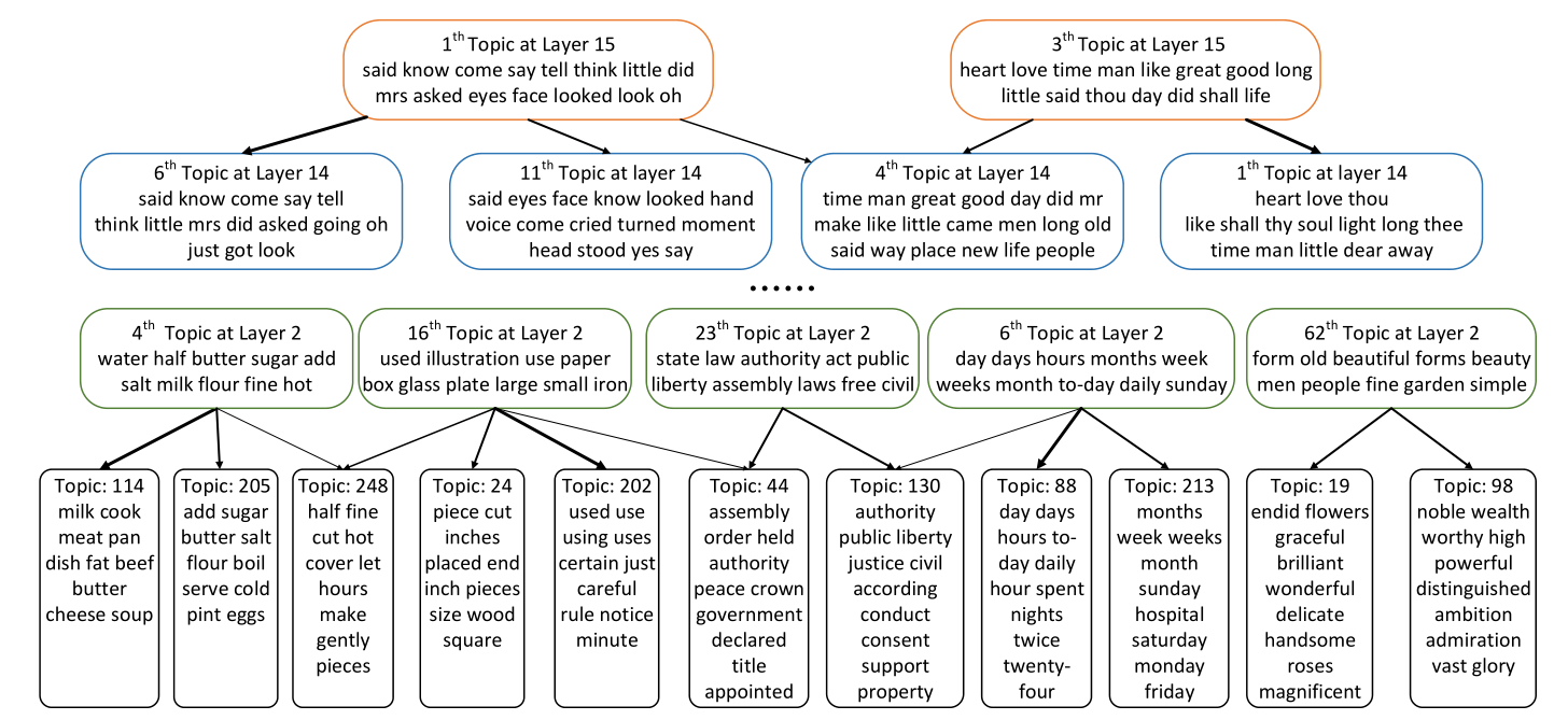 除次之外,鋸齒形網絡結構能夠將多層的網絡參數投影至同一空間中,具有更強的可解釋性。 如圖2所示,語義相似的單詞會投影在相似的區域中,并且不同層的主題也會被投影于同一空間。 圖三中展示了15層的網絡結構,說明在深層依然可以學習到有意義的網絡結構,展示出模型的強大建模能力。