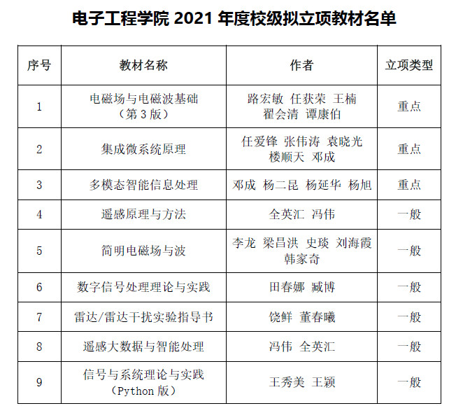 (通訊員方心 李雨煙)日前,學校教材工作委員會經過初審、專家網上評審、專家會議終審,擬對全校60項教材予以立項資助,電子工程學院獲批9項(其中全校重點教材15項,電子工程學院3項),立項數目位列全校第一。