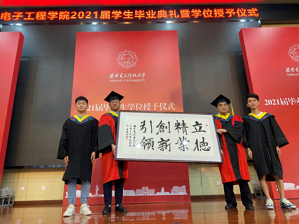 畢業之際,2021屆畢業生為感謝學院培養,學生代表李錦歌書寫了一幅書法作品,表達對于學院和老師的感恩之情,學院副院長鄧成和焦永昌教授代表學院接受贈送。