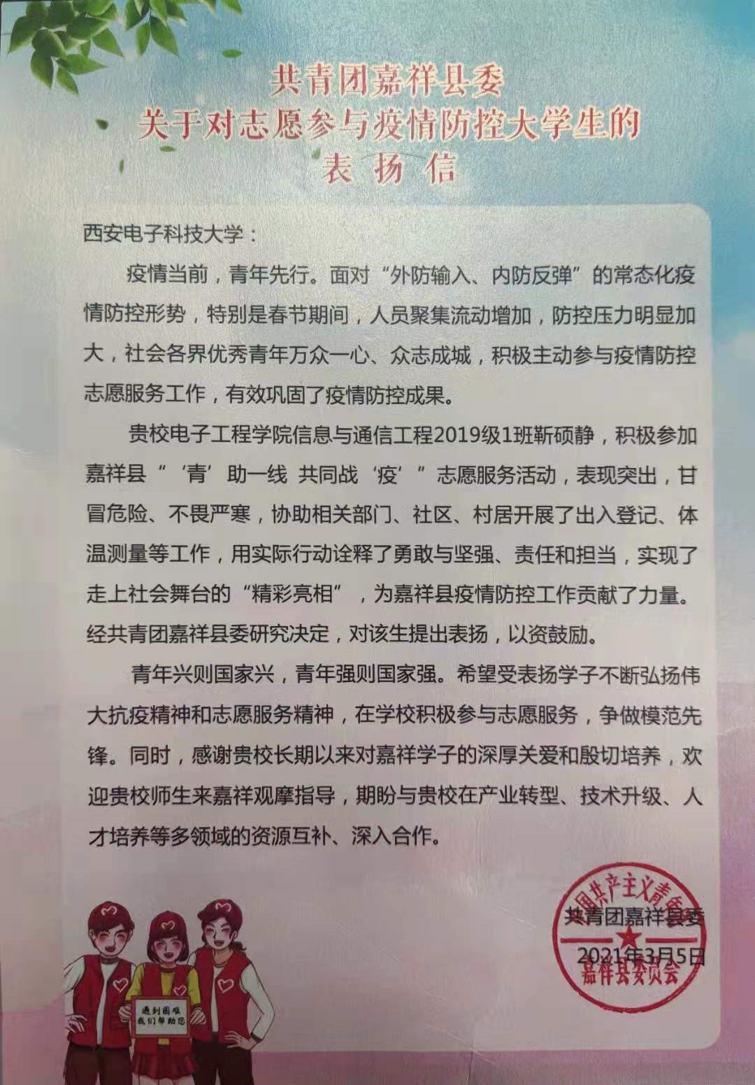 (通訊員 田雪梅 吳紫陽)近日,我校收到一封來自共青團嘉祥縣委的表揚信,表揚我院2019級碩士靳碩靜同學在嘉祥縣“'青’助一線 共同戰‘疫’”志愿服務活動中甘冒危險、不畏嚴寒積極參與志愿服務活動。