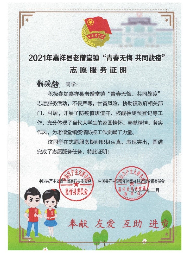 2021年寒假期間,靳碩靜同學主動請纓成為了一名志愿者,她表示在疫情面前挺身而出是我們青年的擔當,義不容辭。在服務期間,她主要承擔的工作有:在村居疫情防控檢測點進行值班值守,對出入車輛及其人員進行往返時間、地點以及身份信息登記、體溫檢測;為全市開展核酸檢測信息預登記作宣傳,幫助一些不懂如何進行信息登記的村民進行核酸檢測信息預登記;通過使用濟寧人社通軟件為60歲以上的老人進行電子社保卡的人臉識別認證等等。