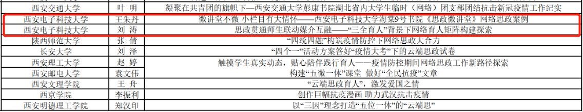 據悉,本次活動由陜西高校網絡思想政治中心組織,以“共抗疫情顯擔當 愛國力行育新人”為主題,共收到省內41所高校的207件作品,最終決出一等獎5項、二等獎10項、三等獎20項、優秀獎30項,我校共有9名輔導員獲獎。