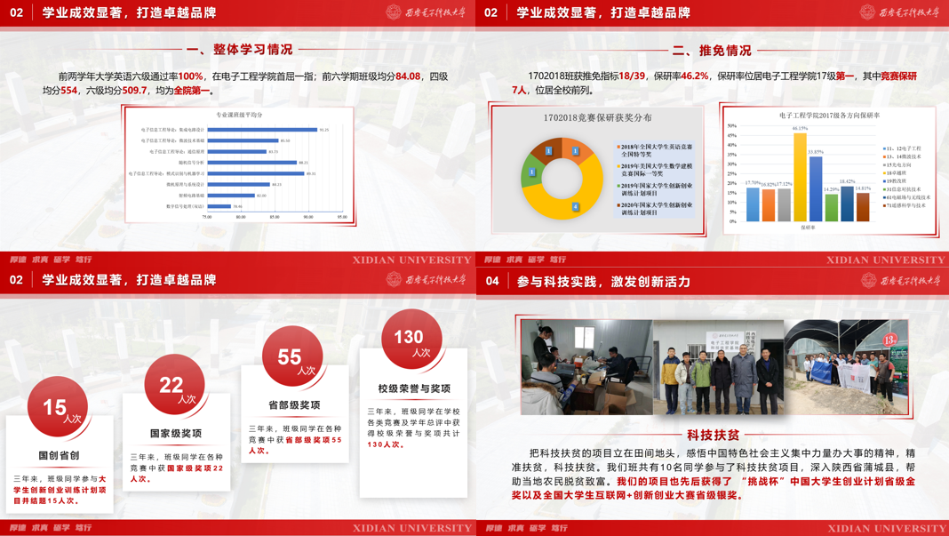 電子工程學院始終堅持立德樹人、以生為本,著力培養基礎知識扎實、專業素養高、創新實踐能力強的現代電子信息領域技術人才,1702018班同學入學伊始,學院就為大家配備導師,激發引導學生學習科研興趣、培養了濃厚的學習氛圍,人才培養效果顯著,學生綜合能力得到有效提升,1702018班保研均分、保研率均位列學院2017級第一,同時也是全校唯一一個大學生英語六級通過率100%的班級。三年來,1702018班同學積極參加學科競賽,共獲國創省創結題15人次,各類學科競賽獲省部級以上獎項77人次、校級獎項130人次。學習之余,1702018班同學不忘反哺社會,先后有十余名同學參與到學校的科技扶貧項目中,給陜西蒲城的中學生們講授電子信息類知識激發學生學習熱情,同時將所學知識應用到當地產業,幫助當地的農民脫貧致富。