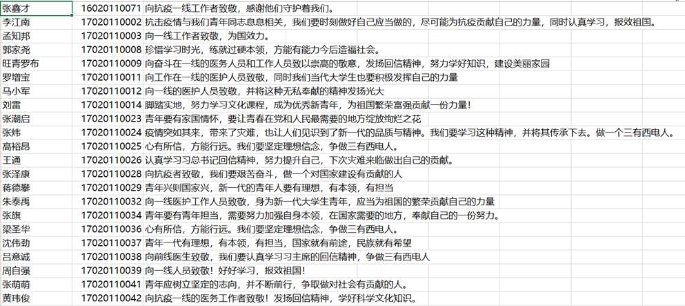 電子信息工程專業高英杰說:“疫情爆發以來,黨中央高度重視,號召全國各族人民同舟共濟、合力擔當,堅決打贏抗‘疫’的人民戰爭、總體戰、阻擊戰,全力以赴保護人民的生命健康安全。全國各地統一行動、積極舉措,在全力支援武漢等疫情重災區的同時,廣泛動員干部群眾清醒認識當前的嚴峻形勢,寧可‘十防九空,不可失防萬一’,‘把疫情防控工作作為當前最重要的工作來抓’,盡銳出戰,務實擔當,堅決徹底地打贏這場我們必須要贏的戰役。”