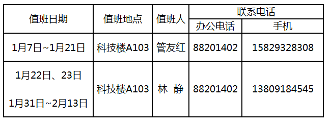 寒假期間,有任何緊急情況發生,請隨時聯系電院值班教師(值班表見電院網站),或學校值班電話:88202212(24小時值班)。