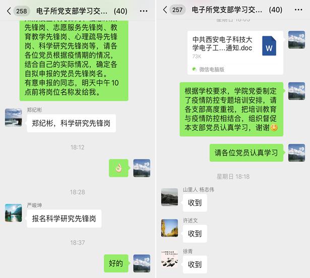 (記者付一楓)“困難當前,黨員當先!面對疫情,我們用實際行動踐行初心使命,以擔當作為給黨旗增輝添彩;作為雷達信號處理領域的國家隊,在積極做好新冠病毒疫情防控的前提下,堅守崗位,加強科研攻關、做好人才培養是我們義不容辭的責任。”西安電子科技大學電子工程學院電子所支部書記蘇洪濤說出了每一個支部成員的心聲。