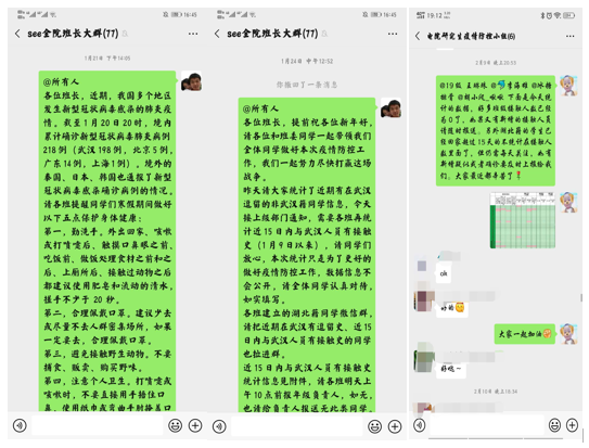 疫情初始,電子工程學院迅速成立電院研究生疫情防控工作小組,研究生全體班委在第一時間投入疫情防控工作,及時認真傳達學校相關政策文件,協助學院開展心理疏導工作,配合輔導員對疫情嚴重地區同學開展一對一關懷工作,排查全體同學所在位置、寒假期間身體狀況和返鄉途中接觸情況,全體同學堅持每日向班委報平安制度,在“疫情通”上線之前有效完成全體同學健康狀況的排查統計工作。