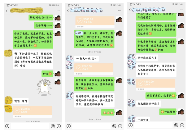 疫情爆發后,電子工程學院研究生輔導員積極開展幫扶工作,對湖北籍建檔立卡、家庭經濟困難的學生保持密切溝通。輔導員對受疫情影響較大的三位家庭困難同學各送去500元慰問金,并積極幫助同學申報學校研究生特殊困難補助,在學校和學院的暖心政策下,同學們更加堅定戰勝疫情信心和決心。