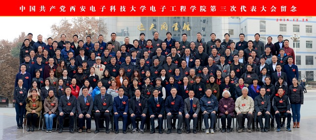上午9時,在雄壯的樂曲聲中,全場起立,高唱《中華人民共和國國歌》。主席臺上方懸掛著“中國共產黨西安電子科技大學電子工程學院第三次代表大會”的會標,后幕正中鐮刀和錘頭組成的中國共產黨黨徽熠熠生輝,十面鮮艷如火的紅旗分列兩側,映照得整個會場莊嚴明麗。