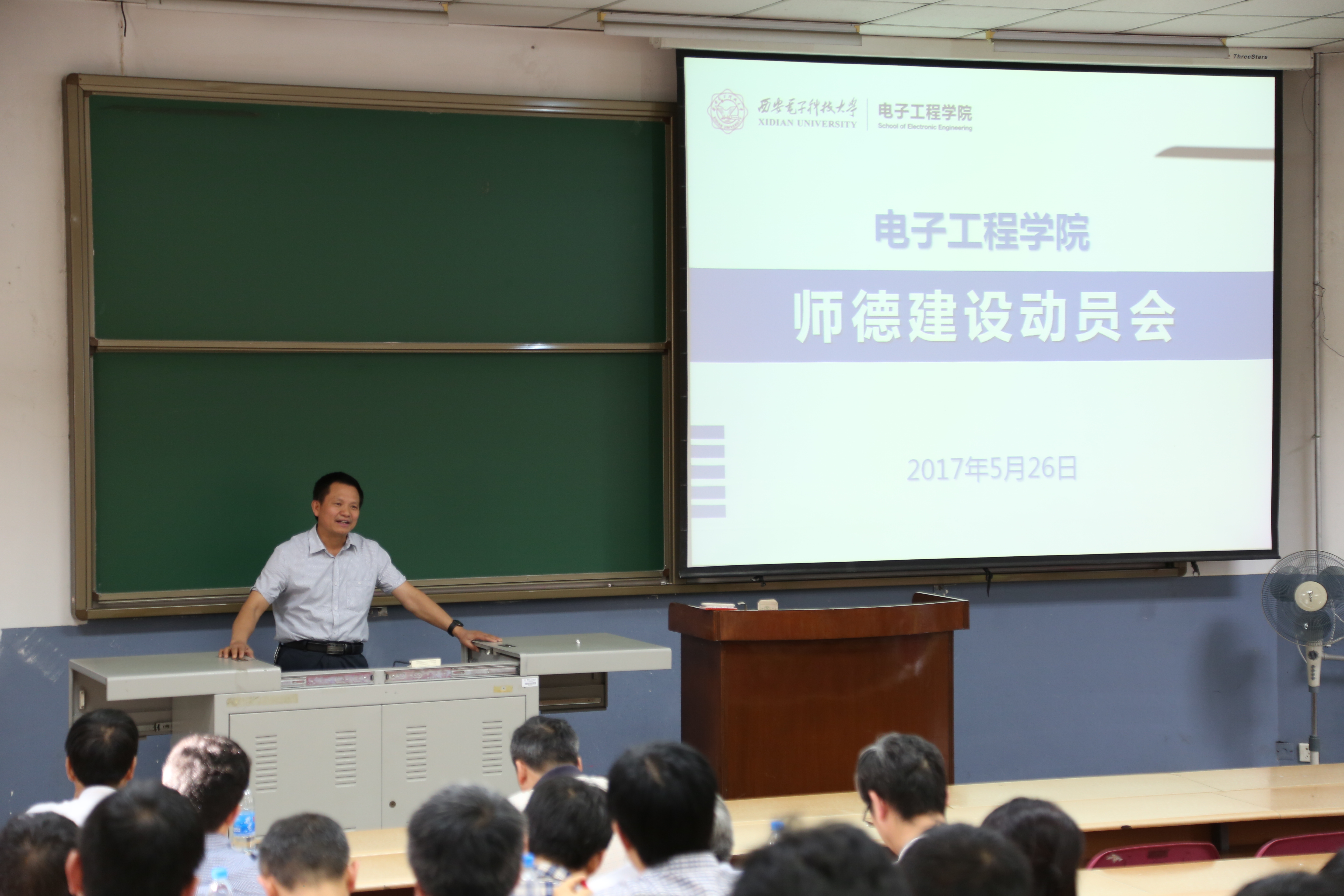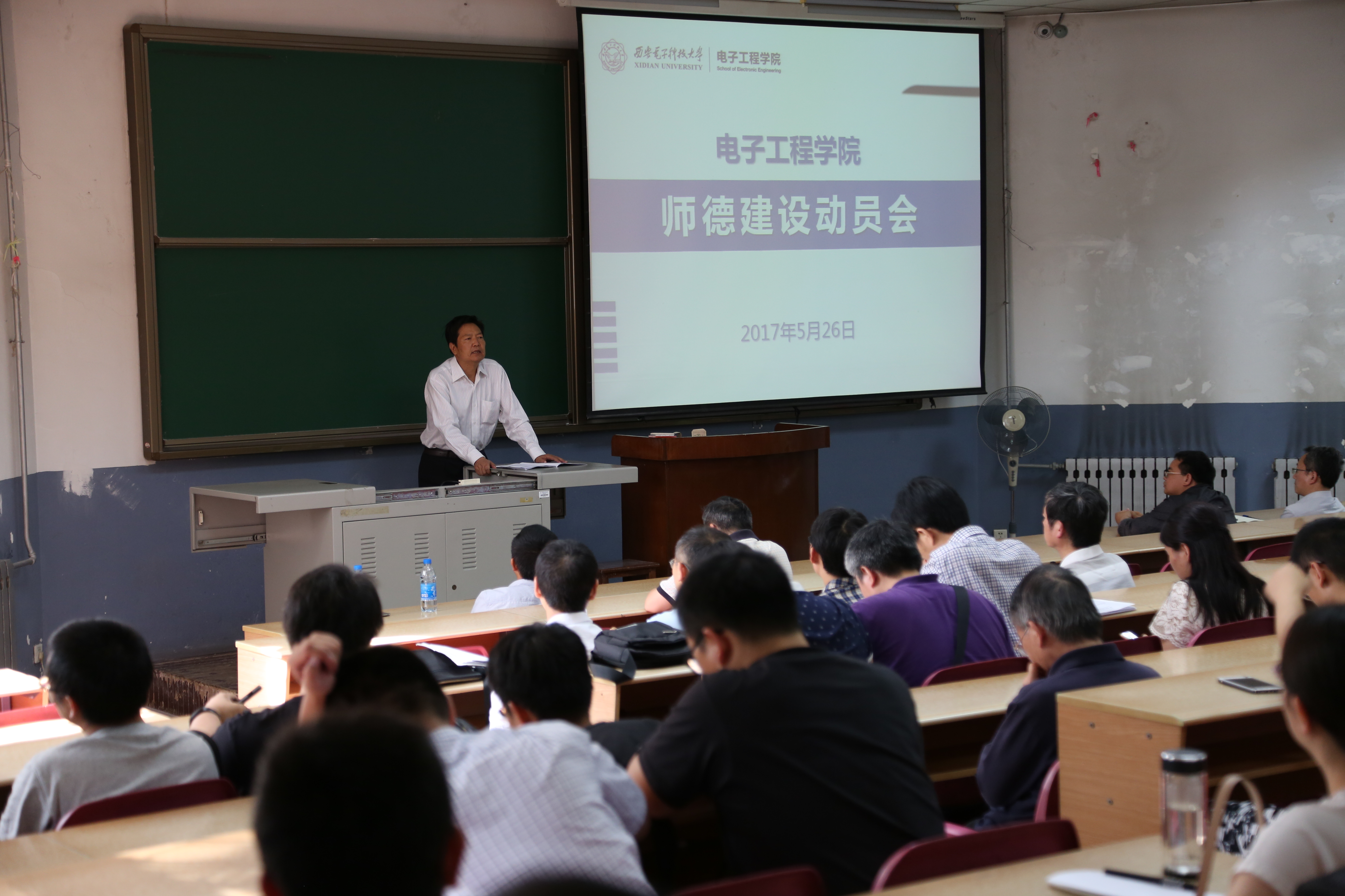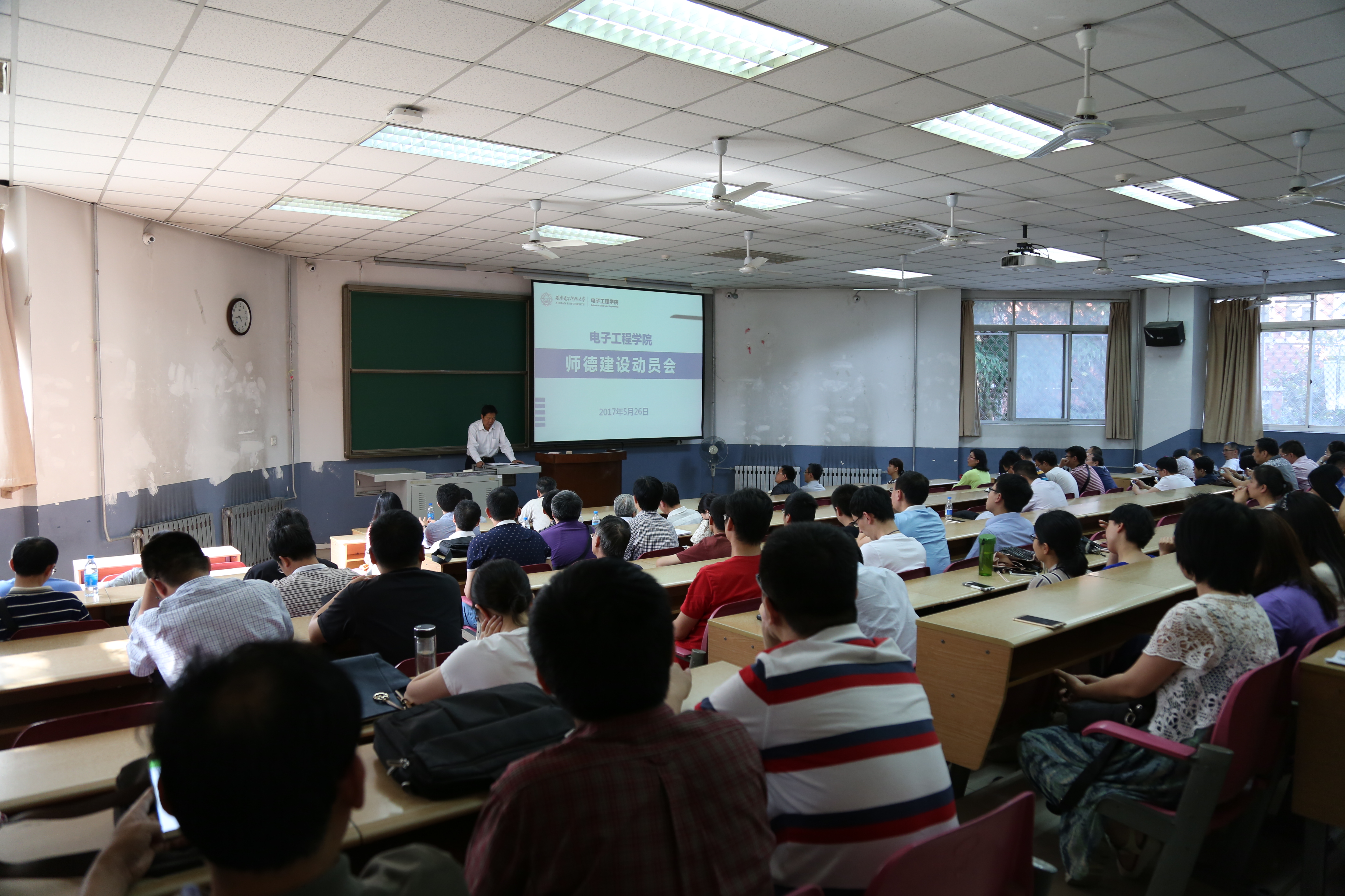 2017年5月26日下午,電子工程學院在階梯教室110召開師德建設動員會,電子工程學院黨委書記徐克、院長廖桂生出席會議并講話。會議由電子工程學院院長廖桂生主持,電子工程學院領導班子成員、教職員工、研究生導師共計150余人參加會議。