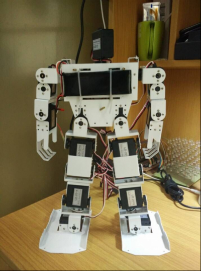 他們首先利用Kinect設備獲取人體姿態的原始骨骼圖像,即在給定三維直角坐標系中每個關節點的x,y,z坐標,并將數據傳送至上位機。隨后,計算機通過濾波得到穩定的骨骼數據,將由骨骼點的三維坐標進行向量運算,計算出骨骼之間,即關節的轉動角,并將角度按照一定格式傳至機器人身上的控制器。最后,通過控制器處理并譯碼,從而控制舵機工作,使得各個舵機運動至指定角度,進而實現了機器人實時模仿人體運動。
