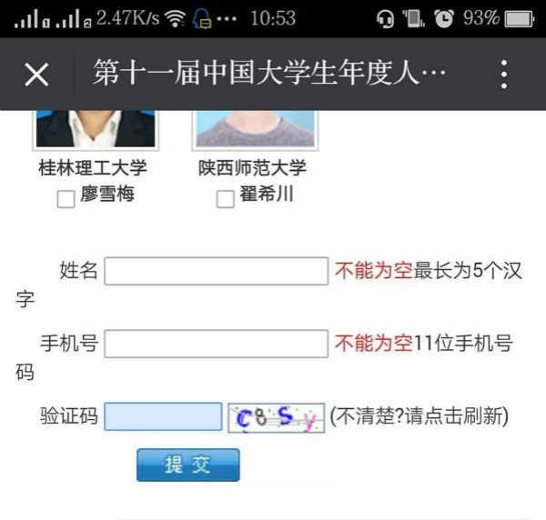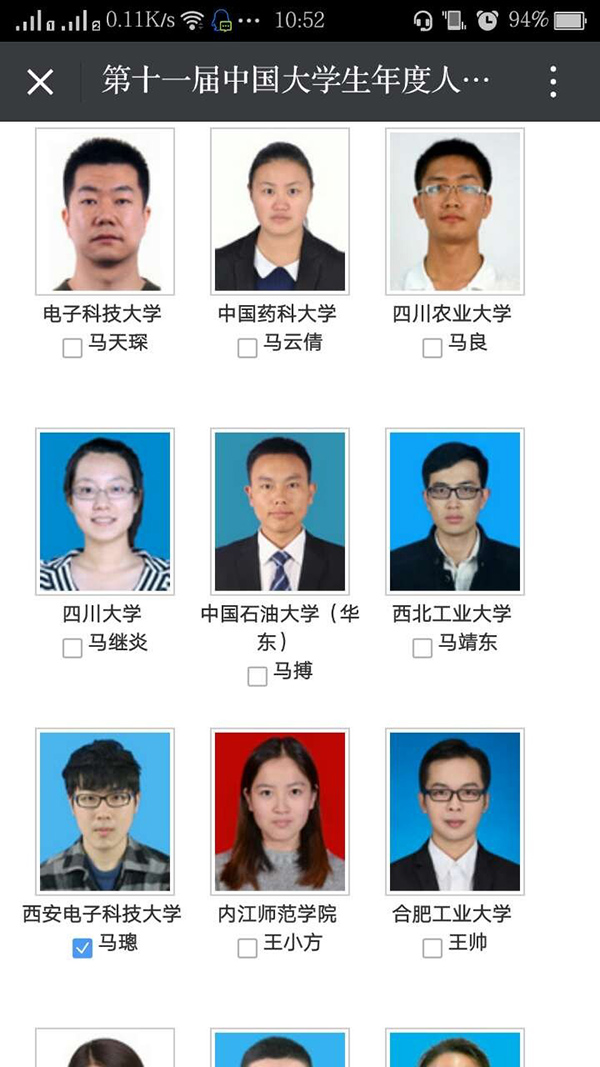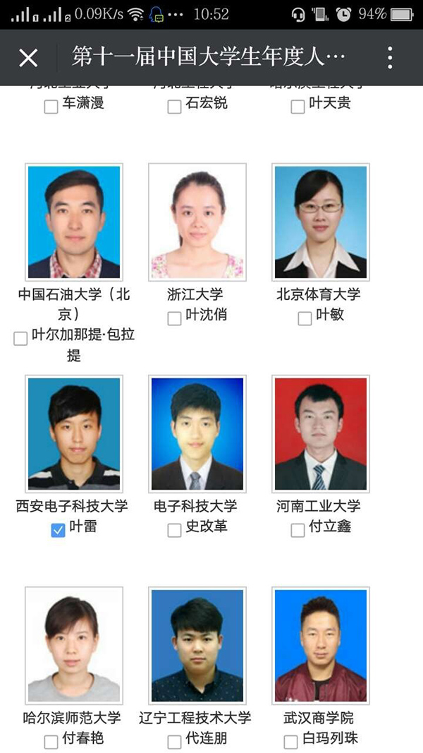 誰說西電沒帥哥不服進來看! 2016-05-03 20:30:00 瀏覽次數: 女孩對于帥哥的標準是什么?一要帥二要有才。 小編來到西電還真沒怎么見過二者得兼的,不過下面這兩位學長,真真的顏值與智商并存,人家現在可是“第十一屆中國大學生年度人物”的候選人哦! 馬璁,12級本科生,正宗學霸,數模挑戰杯不在話下。 葉雷,13級國防生,三破國家記錄的游泳健將。 西電代有才人出,沖著這么兩位帥哥,小編我要去給他們投票了!點擊閱讀原文,轉到“第十一屆中國大學生年度人物”投票網站按照如圖方式投票。 小編實力操作用時不到一分鐘趕快給學長們加油吧! 閱讀原文 上一篇文章:關于青年教師赴國內重點研究機構、企業掛職鍛煉有關事項的通知 下一篇文章:轉教務處發:五一后作息時間表