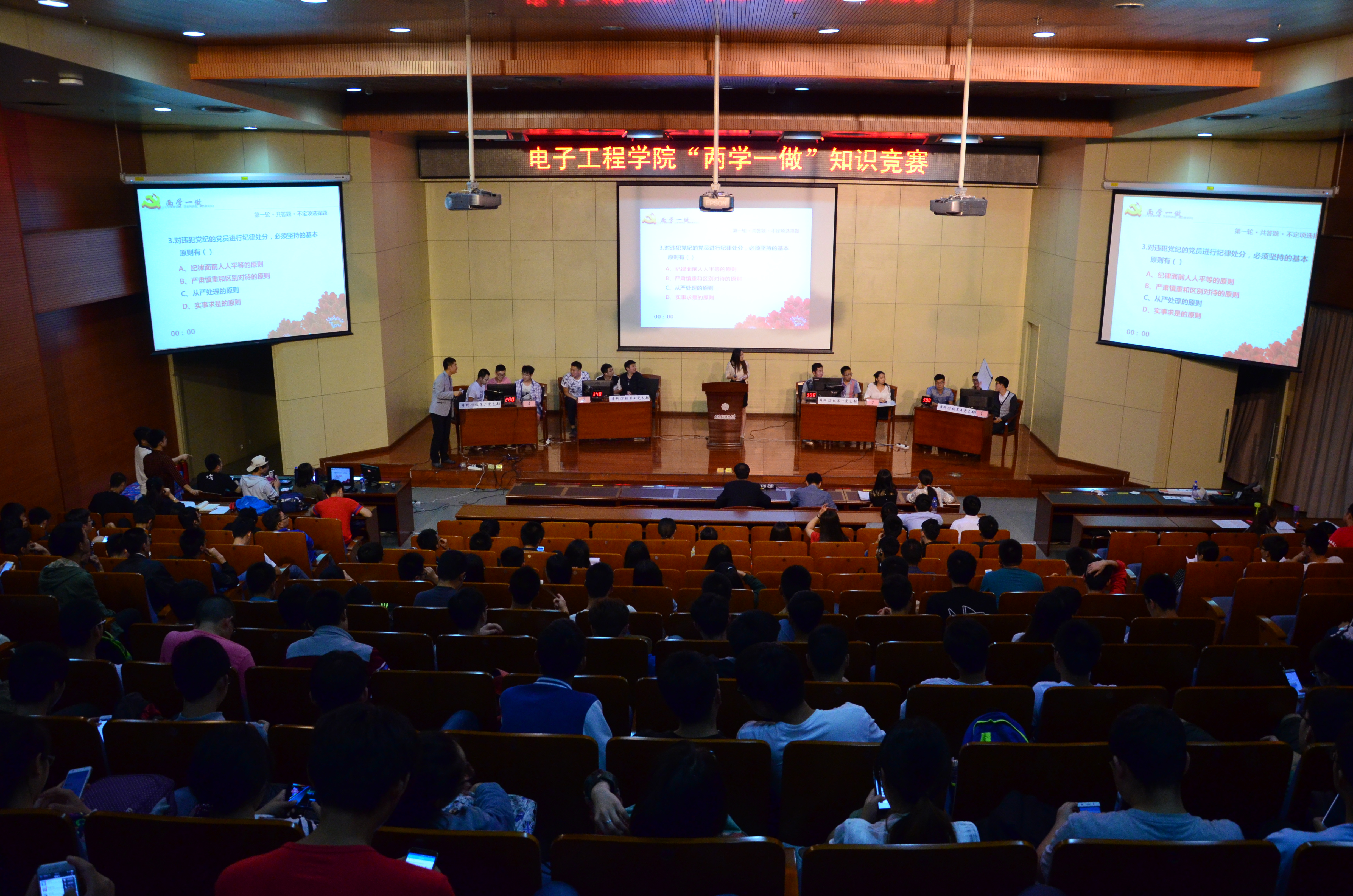 經過充分的組織和備賽,5月12日晚電子工程學院“兩學一做”知識競賽在新校區行政樓206報告廳舉辦了第一場晉級賽——本科生組的比賽,來自本科十余個支部的優秀黨員代表參加了比賽。