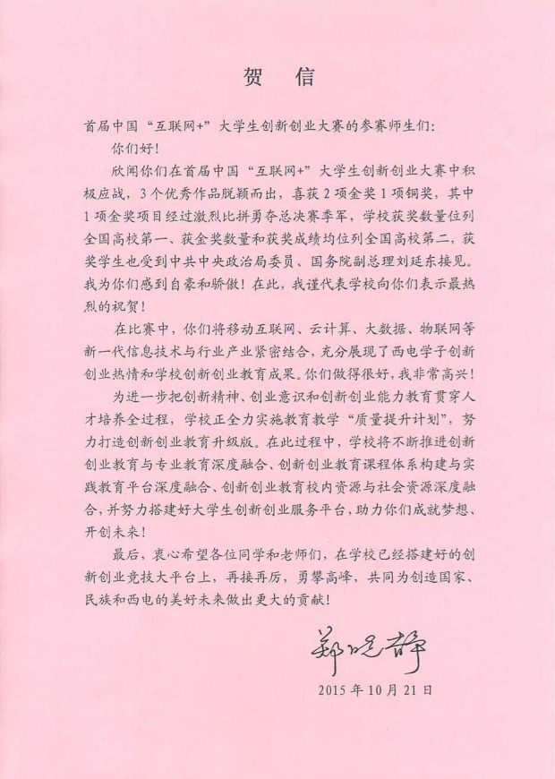 校長鄭曉靜院士給“互聯網+”大學生創新創業大賽參賽師生的賀信