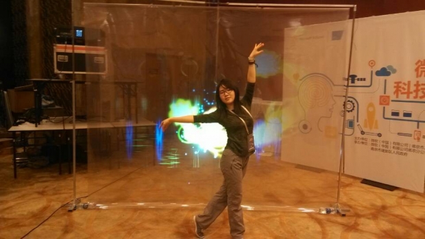 參賽隊員正在演示“光影隨行-舞蹈輔助特效伴侶系統”
