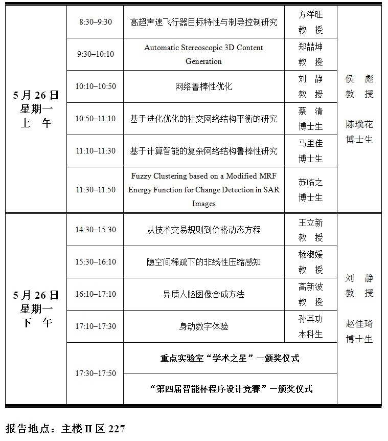 “智能感知與圖像理解”教育部重點實驗室第十二屆學術周日程安排 2014-05-22 12:52:00 瀏覽次數: 上一篇文章:關于召開2014年專業技術職務評審相關事宜的通知 下一篇文章:第九屆青年教師講課競賽結束 電院教師成績優異