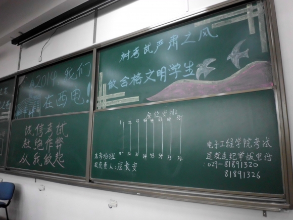 西電新聞網訊(通訊員 錢德年)近期,全校進入期末考試階段。為了進一步嚴肅考分考紀,營造積極向上的考試氛圍,電子工程學院充分發揮學生的自主性和創造性,各學生班級在各考場布置黑板報,創建誠信、拼搏的考場文化。