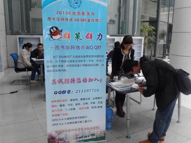 為深入讀者群體,優化服務品質,及時解答廣大讀者在使用圖書館資源和服務中遇到的問題,結合2013年圖書館優質服務月活動,圖書館建立網絡咨詢QQ群(群號:211197726),搭建與讀者交流的又一平臺。該群咨詢團隊成員由圖書館領導、部室主任和業務骨干組成。