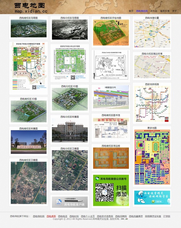 經過一個暑假的精心制作,西電導航團隊終于完成西電地圖網的設計制作。西電地圖網收集西電歷史上出現的各種地圖,它匯集了西電南北校區平面地圖、三維地圖、鳥瞰設計圖、手繪地圖、漫畫地圖、教室分布圖、方位地圖、街景地圖、衛星地圖、地鐵地圖等,從1958年西電遷校到2013年西電手繪地圖,時間跨度超越50年。讓你從不同的時間點看西電校園的變遷,從不同的空間角度去看西電的今日發展,讓你從全新的視角去觀察西電,為在西電工作學習的師生們帶來便利。地圖資料的收集跨越十年時間,最初的構想到實現經歷了五年,終于在2013年夏天完成!