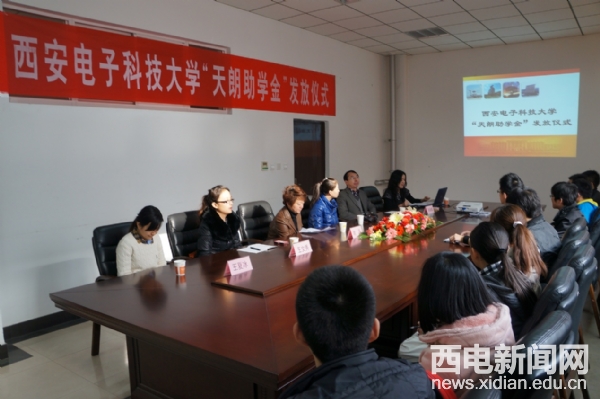 西電新聞網訊(通訊員 周靜)12月7日下午,西安電子科技大學第二屆“天朗助學金”發放儀式在南校區信遠樓Ⅱ區233會議室舉行。25名優秀學子獲資助,助學金總額共計5萬元。電子工程學院黨委書記鄧卓峰和西安天朗地產集團有限公司高級主管謝晶女士一起為同學們發放了助學金。
