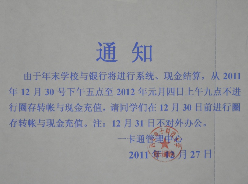 2012元旦期間一卡通暫停充值的通知