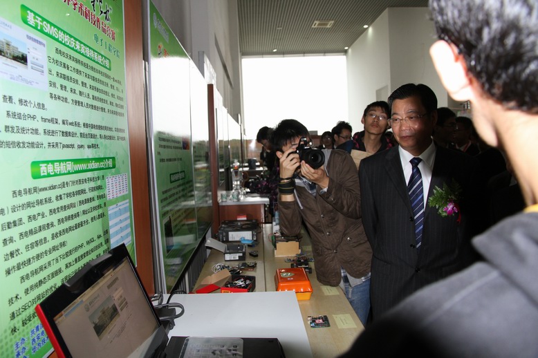 龍書記 參觀電子工程學院展臺,觀看 《西電導航網xidian.cc》和《校慶接待系統》作品展示