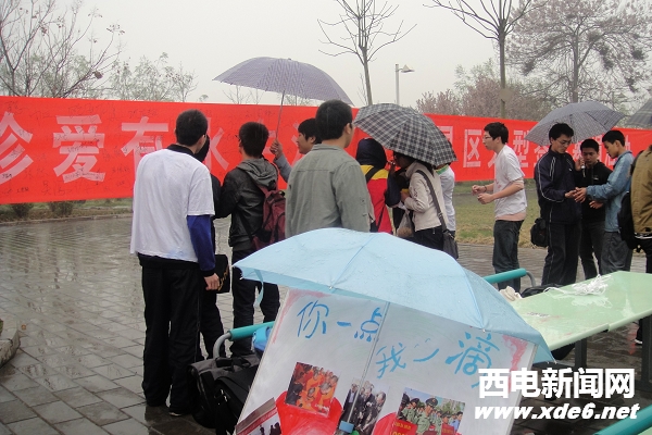 西電新聞網訊(通訊員 張海戰 周靜)去年冬季至今春以來,我國西南地區大面積、長時間的干旱狀況,給西南地區的群眾生活以及農業生產帶來嚴重威脅。3月31日,為支持西南地區人民抗擊旱災,電子工程學院2009級組織學生在南校區舉行了題為“節約生活用水,珍愛有水生活”支援旱區大型簽名募捐活動。