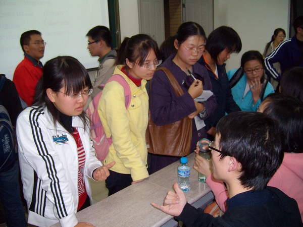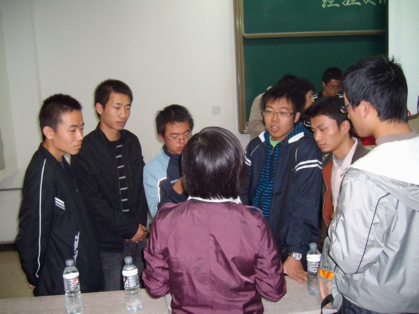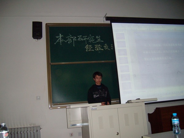 七點整,交流會正式開始。此時能夠容納大約150人的小教室早已人山人海,過道和后排都擠滿了渴望通過此契機與研究生學長們面對面地交流的本科生們。首先,電院學生會的主持人致歡迎辭,歡迎從老校區驅車前來的研究生學長們。其次,電院研會主席團副主席莊雄同學簡單介紹了本次交流會主題并對為促成此次交流會而辛勤籌劃的所有同學表示感謝。然后,由研究生會學術部主持人孟祥飛同學分別介紹了參加本次交流會的7名優秀研究生代表。當介紹到他們的優異成績時,現場不斷響起熱烈的掌聲。