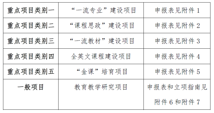 教育教學改革研究項目以教育教學一線人員、中青年骨干教師為主體,以實踐、應用為主要特征,以提高教師能力、提升教學質量為根本目標。項目包括重點項目和一般項目,其中重點項目包括五個類別:
