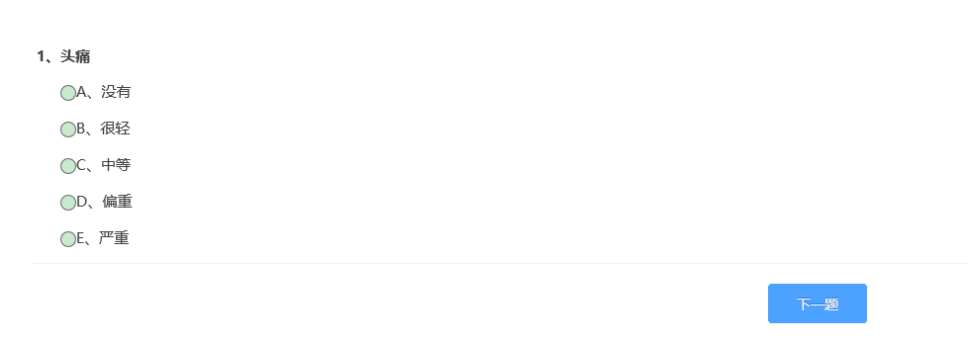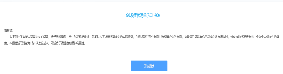 點擊“心理測評”圖標后,可看到參與測試的量表“90項癥狀清單”;點擊量表名稱后面的“鉛筆“圖標,即可開始測試,如下圖: