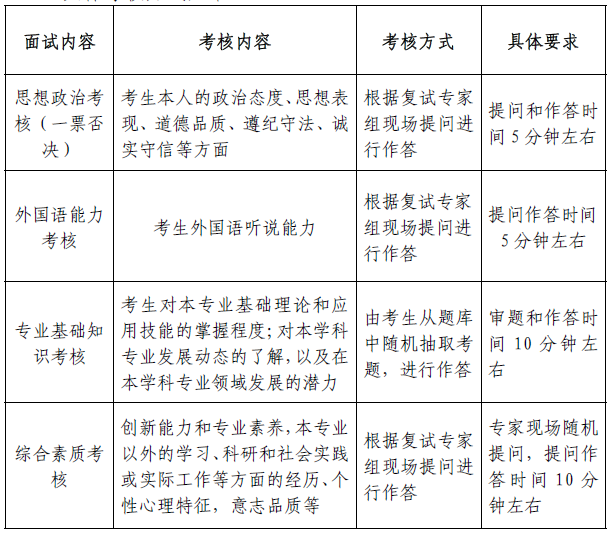 ① 復試內容:主要包含思想政治考核、專業基礎知識考核和綜合素質考核、外國語能力考核四部分。